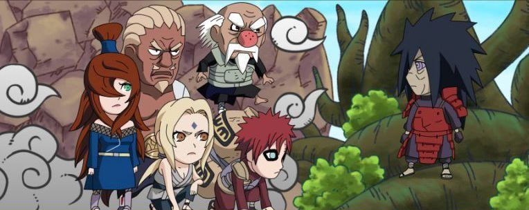 被动防御的斑也终于开始了反击,利用须佐释放大量勾玉攻击五影,危机时刻所幸我爱罗与土影及时恢复,迅速使用岩石巨人与砂之盾双重守护抵挡勾玉。