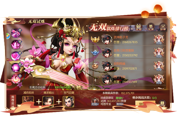 首充赠送吕布,越是残血爆发输出越高,3阶解锁技能可以免疫一切伤害最高8秒,可搭配华佗为其续航。