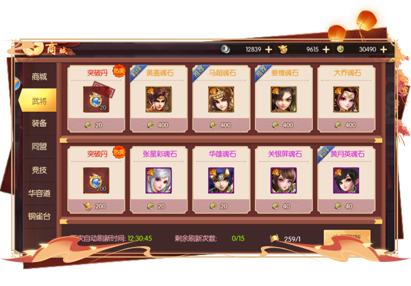 武将、同盟、竞技商店里都可以兑换武将魂石,其中武将商城每日有特定的刷新次数,刷新出不同的碎片,玩家可以消耗将魂令兑换所需的武将魂石;同盟商城中可以消耗同盟捐献兑换曹仁和董卓魂石,竞技商城中可以消耗比武币兑换诸葛亮和小乔魂石,集齐后即可在背包内召唤武将。