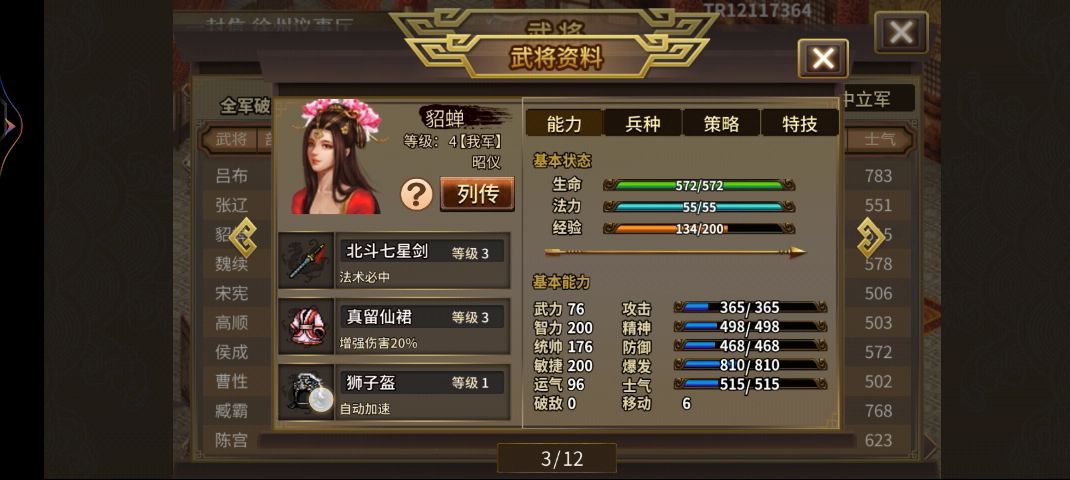 以我自己的情况给大家一点参考。以第50周为例,培养了吕布(武力吃满,特技没满)、魏续(武力吃满)、沮授(智力、好运吃满,商店特技吃满),无尽到50,拿了一纹无尽令做光环。