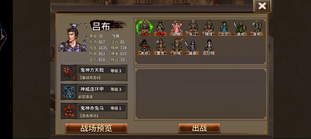 吕布清场,先清弓兵,其他部队在敌军攻击范围外,敌军阶段让近战部队攻击吕布,让吕布反击清兵。