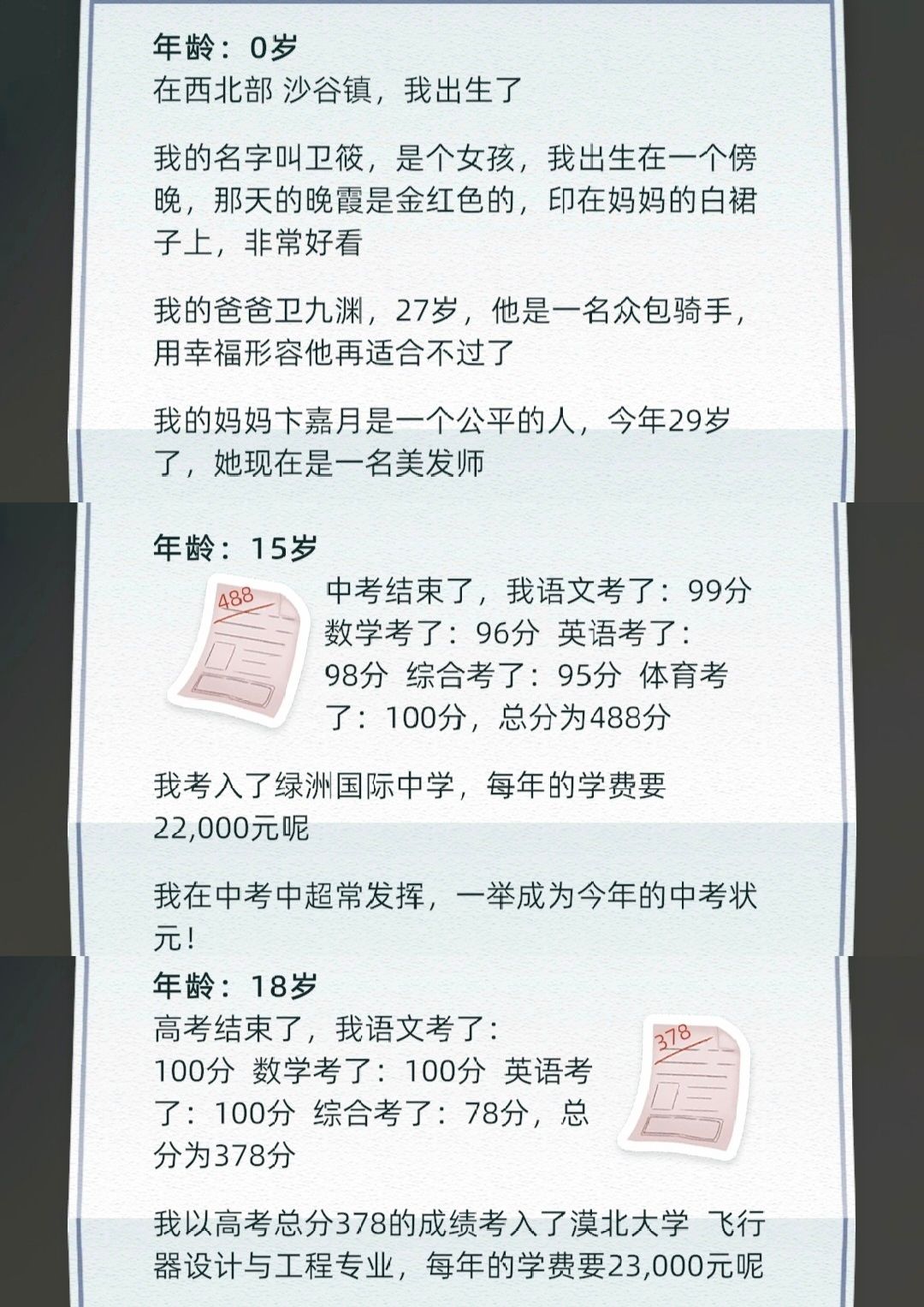 我,出生在一个小小的沙古镇中,过着无忧无虑的童年,好好学习,中考成状元,高考却因失利,与状元失之交臂,前往漠北市的漠北大学