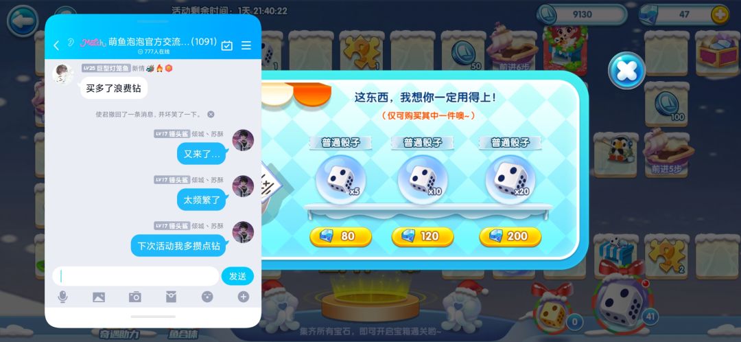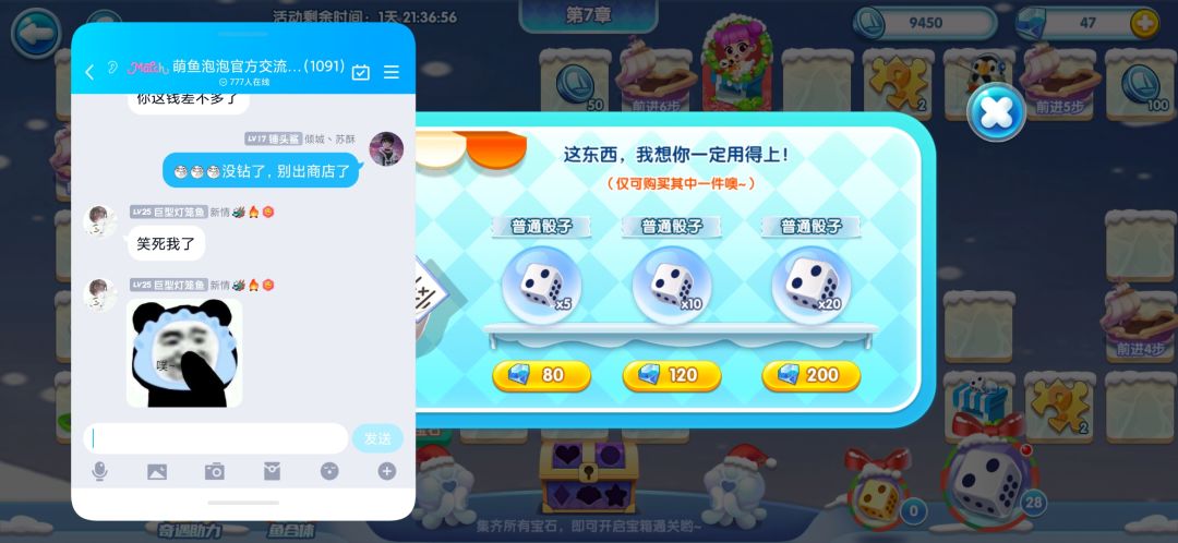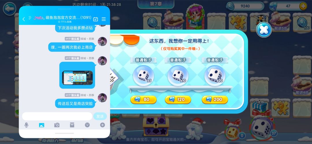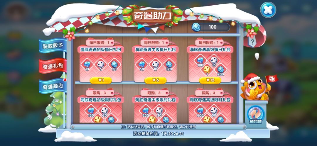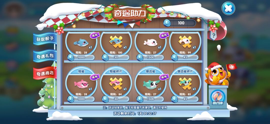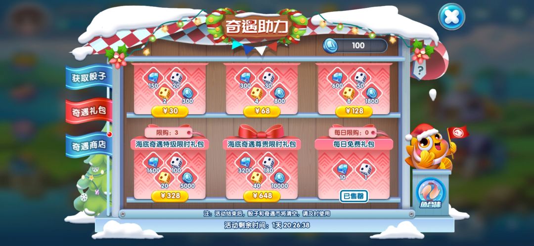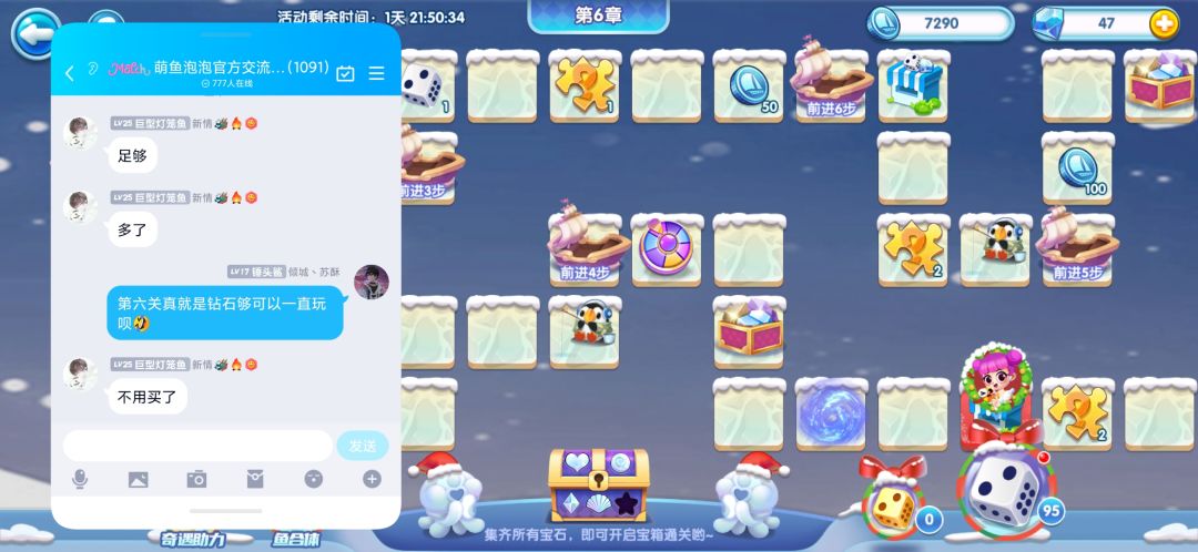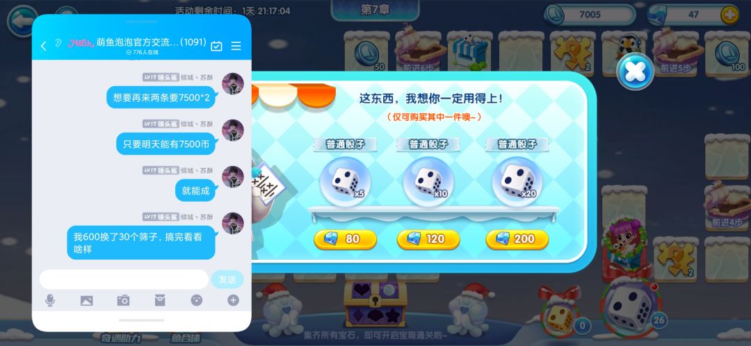 一.如图所示,我从66个骰子1500钻开始刷的第六章,因为钻不够多,骰子用完刷了5000兑换币,相当于1500钻=5000兑换币+若干活动鱼碎片。根据刷到商店的频率,只要钻石够多,骰子会越来越多,200钻可以换20个骰子。