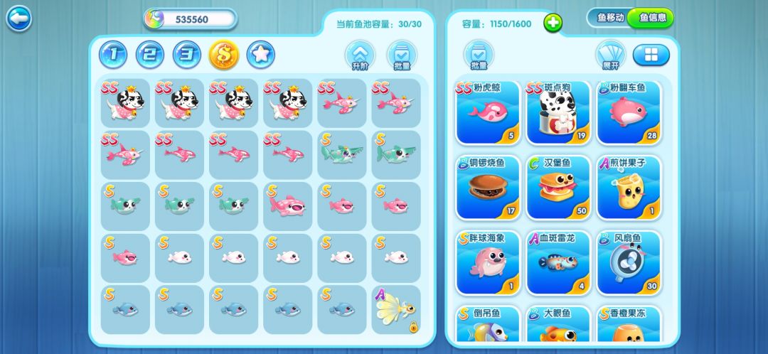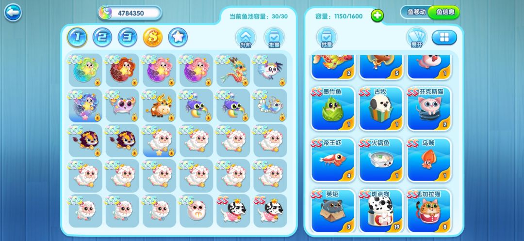四.如下是我花了两天时间,花费1元+6000多钻石所获得的鱼(每个人看运气情况,主要是卡第六章,前期用任务定点骰子速通第二关)。