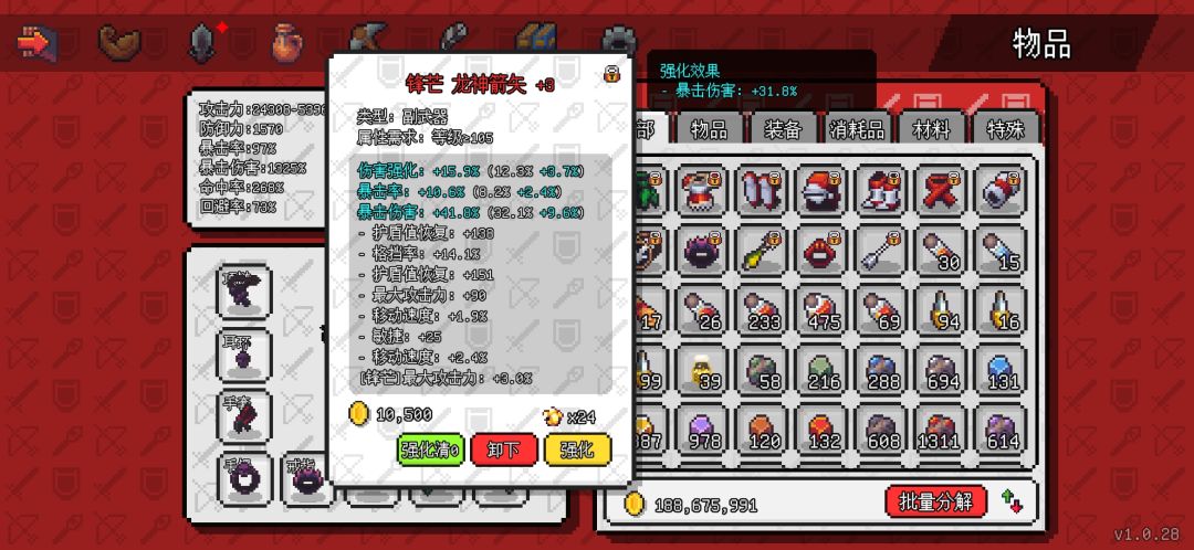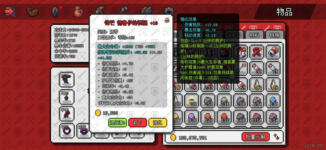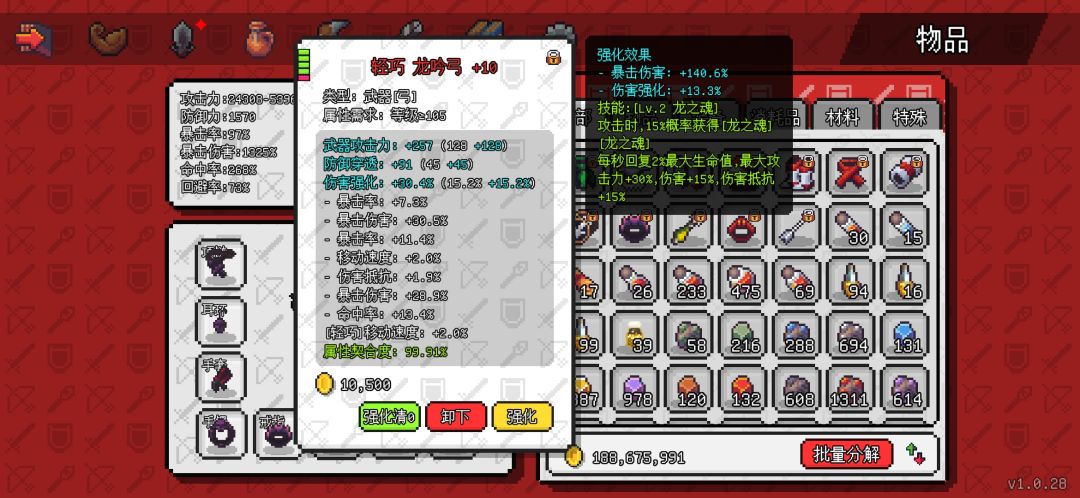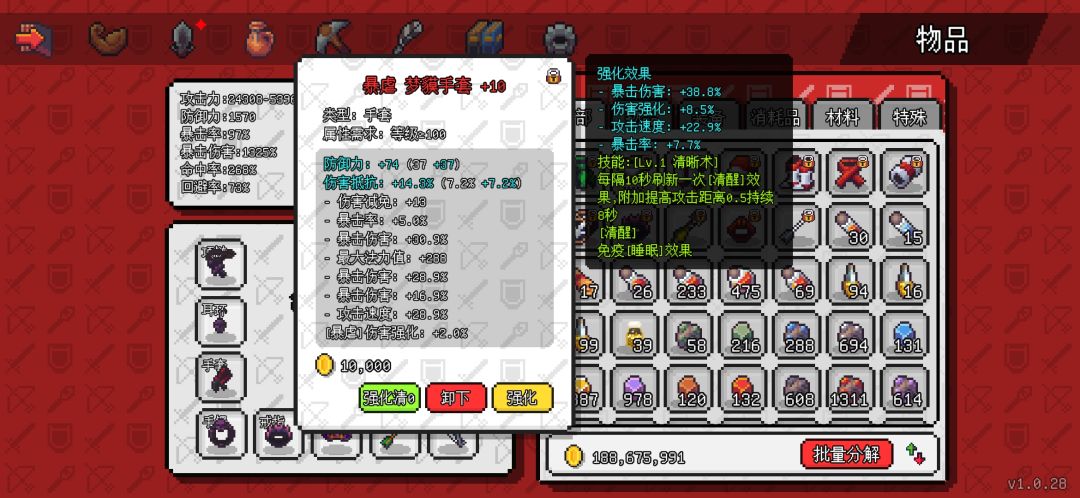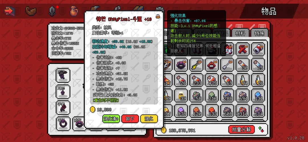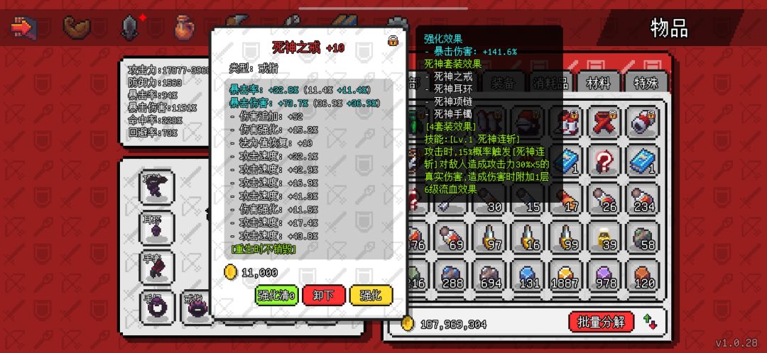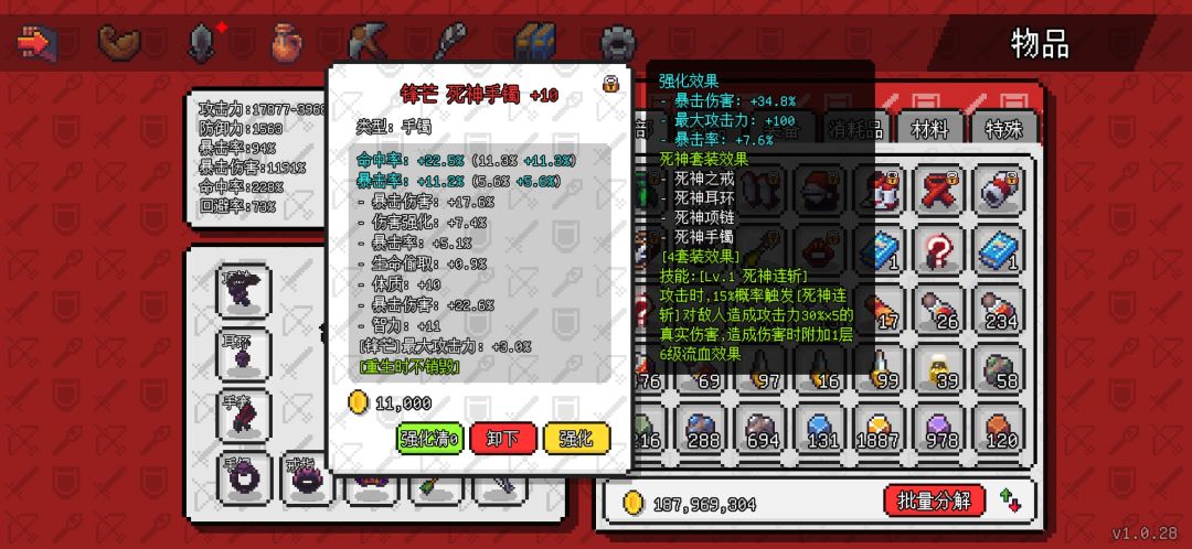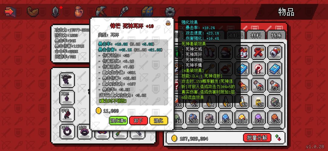 先是死神四件套,原本我也有想用其他单品首饰的,可以多几个装备技能,但是转生10次后基本不需要啥技能了靠伤害硬堆都能把目前所有怪堆死,而死神首饰是目前唯一的110级首饰装,属性会高出不少。强化的话没有一味追求单一爆伤 ,伤害强化也是不错的属性,后期会把耳环和手镯强化再洗一下,暴击是以前留的目前有点溢出了,改爆伤。