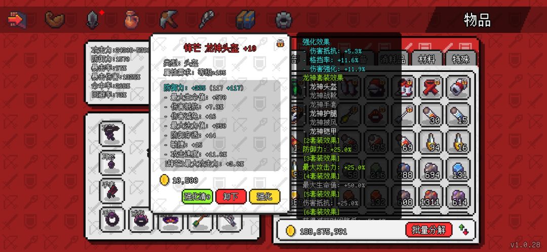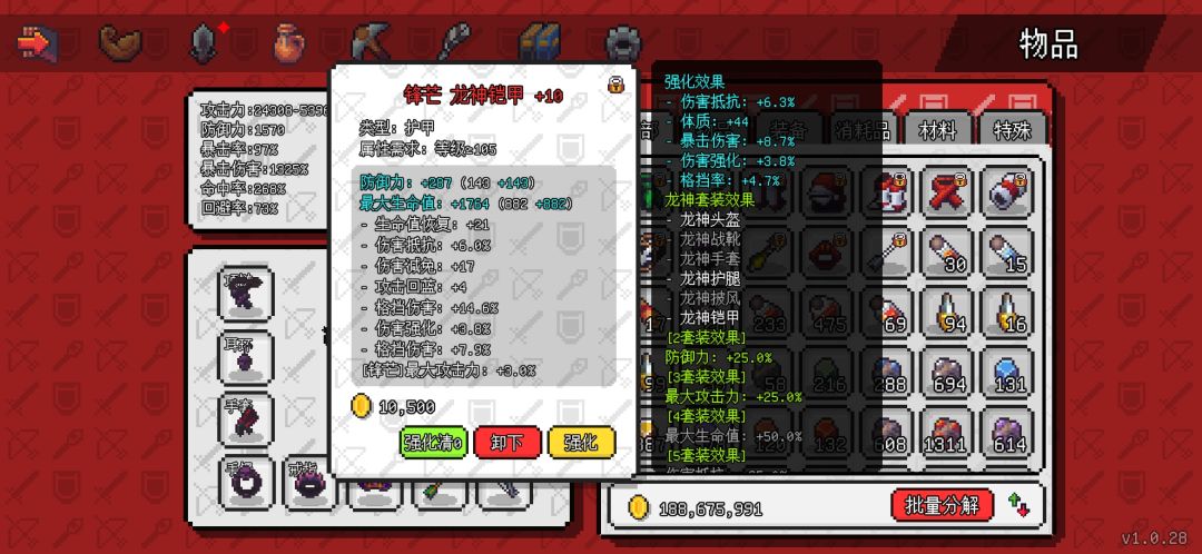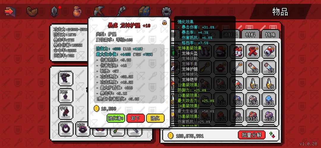 头盔护腿衣服用的龙神套,因为龙神套是105装备里唯一的可以不用6件才能有装备效果的套装了,暗影套没用过不清楚,游侠套暴击溢出让我 太难受了。防具不是特别好,但我想等新装备也懒的洗了。
