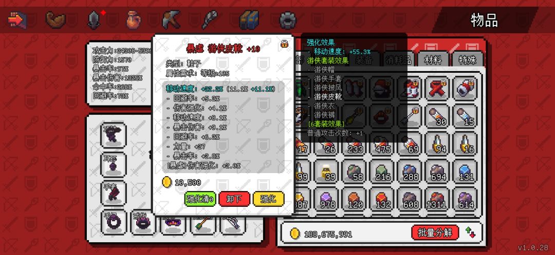 鞋子游侠鞋和暗影鞋都可以,但是暗影是加暴击,游侠加伤害增强我选游侠。鞋子强化必选移速,妈妈再也不用担心我跑尸慢了。