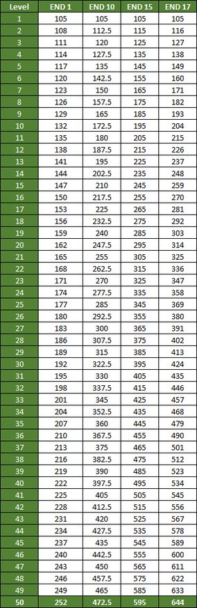 (Level为居民等级,END1为E属性为1,END10为E属性为10,以此类推。右四列的数字为不同等级下对应不同E属性值的血量)