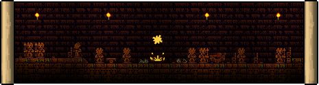 打法:神庙内放置祭坛的房间一般情况下是够大的,可以直接在神庙内作战,但要注意清除神庙内的机关,包括尖刺和触发陷阱的开关,在距离房间底部25格左右开始搭建平台,三层左右足矣。可以摆上一些增益物品。玩家只需在平台上左右跑动即可躲开攻击。