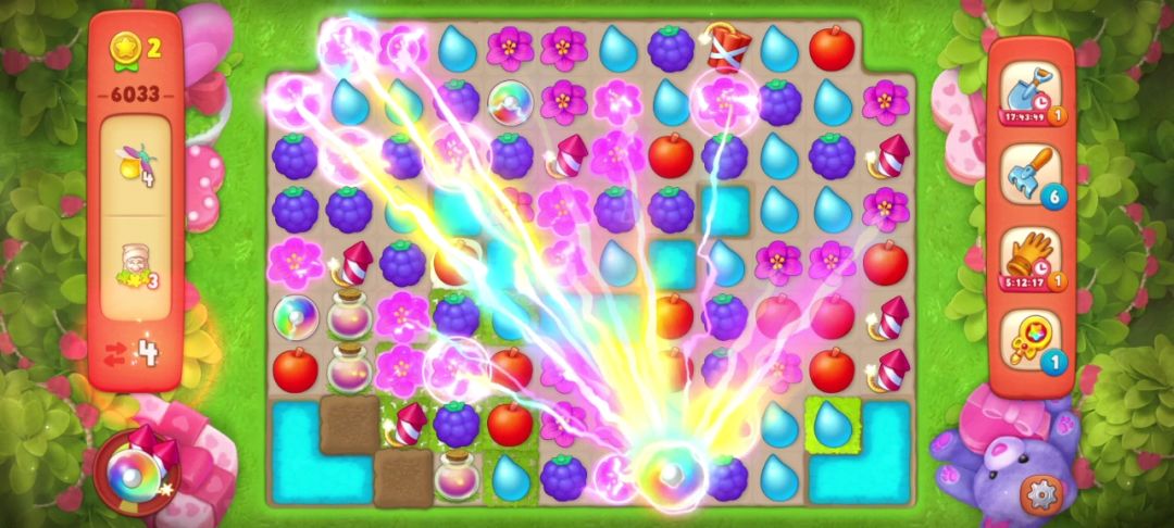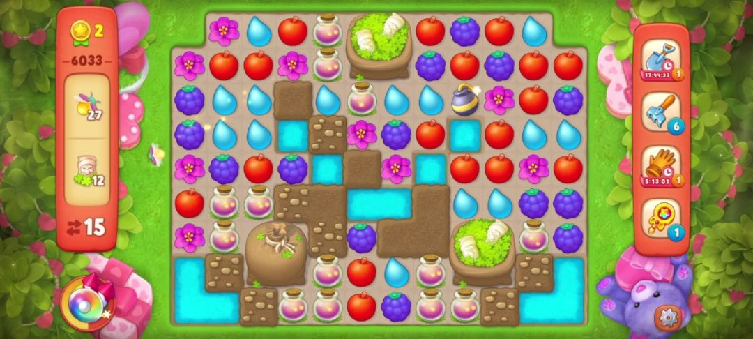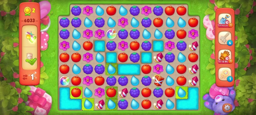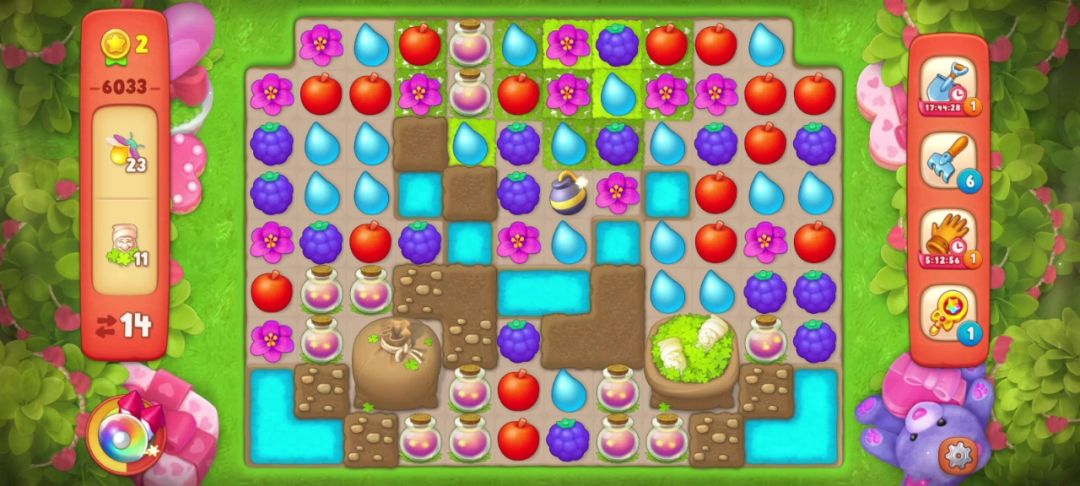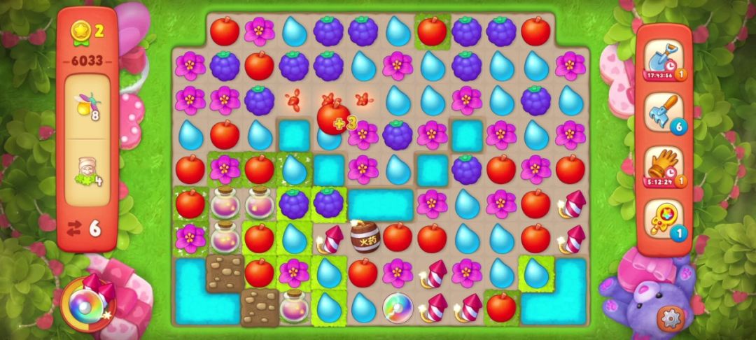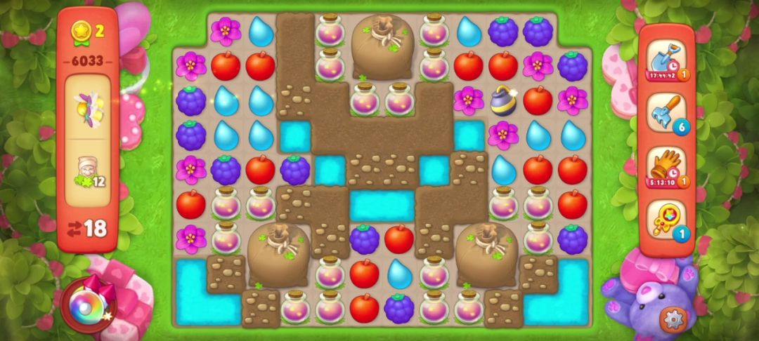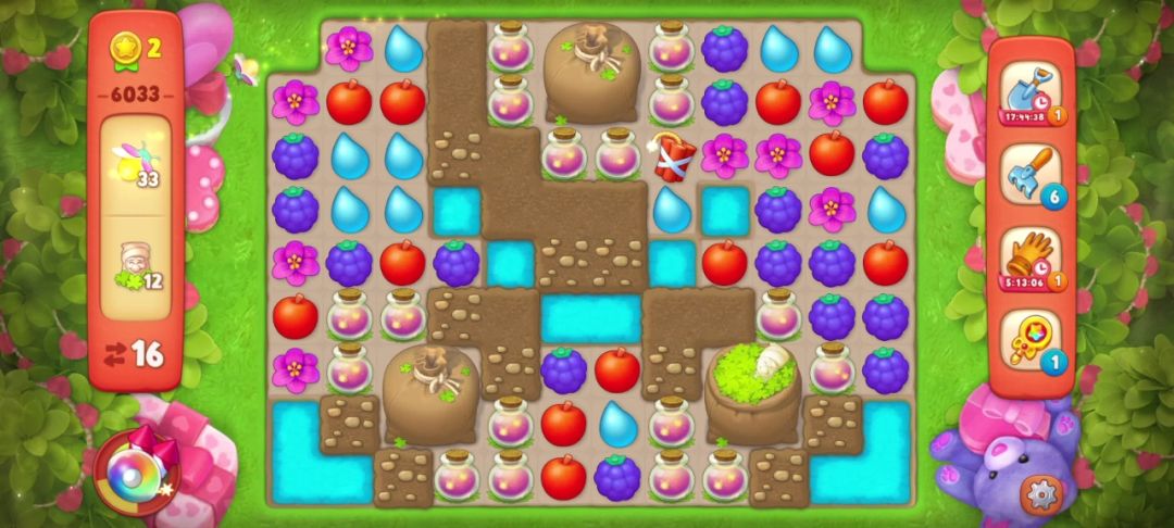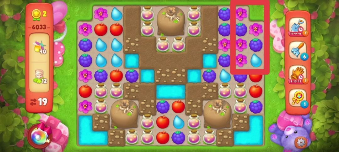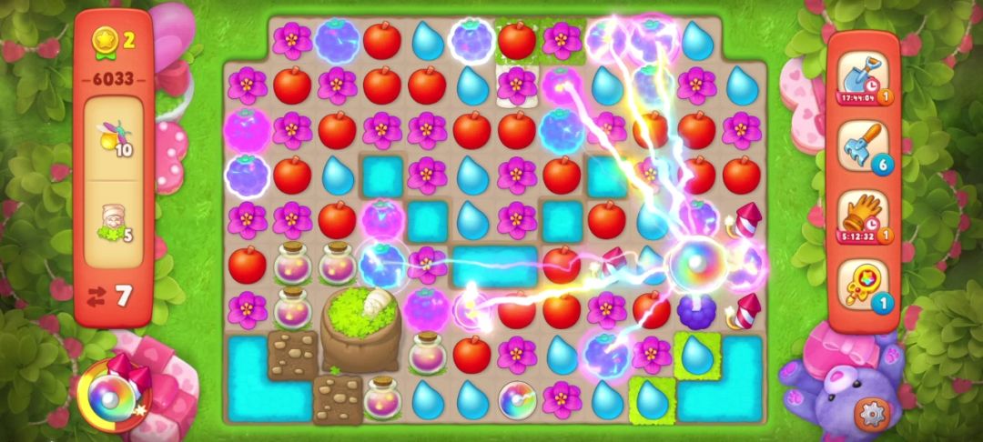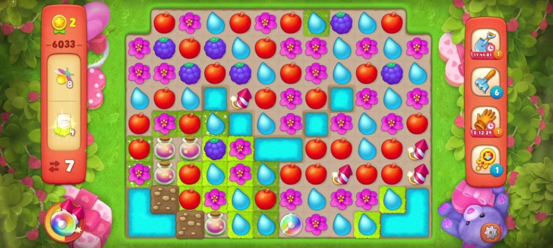 ③当出现两个彩虹球,并且无法凑双彩且剩余的目标无法通过一次全屏清除收集完的时候,要把彩虹球与解除最多目标物的元素匹配。如下图,我的步数只有7步,最后一个落叶袋还需要匹配两次才能打开!仔细观察后我选择和葡萄匹配,如果运气好掉落的花朵还可以再进行一次匹配,这样能节省一步!事实证明我的选择是对的!