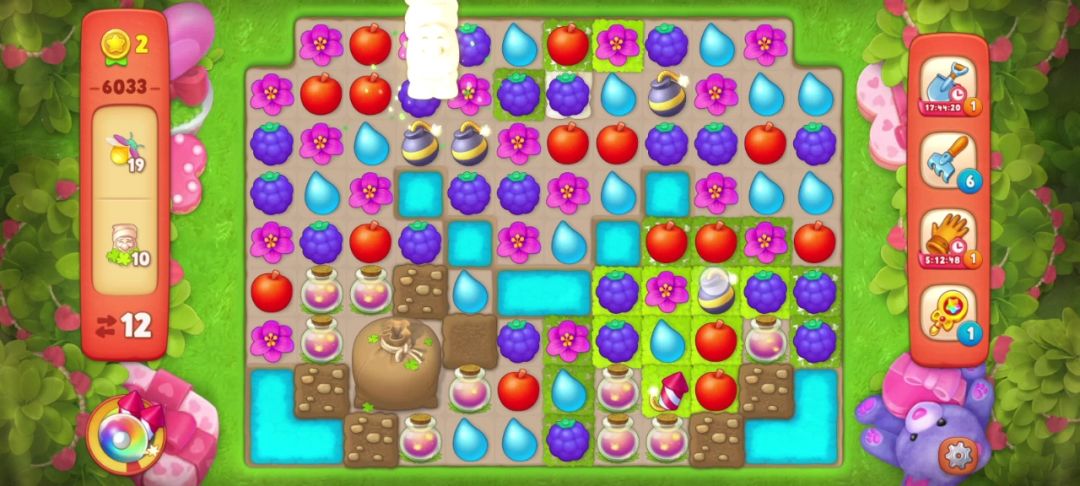 接下来就是收集目标物了,如下图运气好获得一个T/N/T,这样能把小矮人上面覆盖的草皮清理掉一层!然后就是用彩虹球和与目标物解除最多的元素进行匹配!惊险过关(。・ω・。)ノ