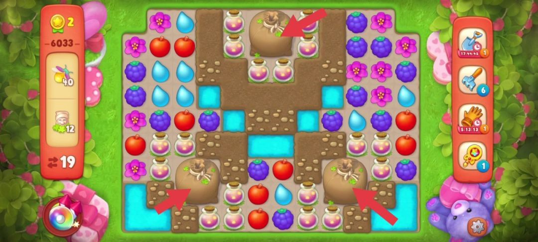 ①观察开局:如上图所示,本关的目标小矮人分别藏在三个落叶袋里,并且落叶袋被萤火虫罐子和土块包围!每个落叶袋藏有4个1×2的小矮人,这一关是困难关卡步数比较少,所以重点就是尽可能用最少的步数放出小矮人!多合成道具制造连锁爆炸!