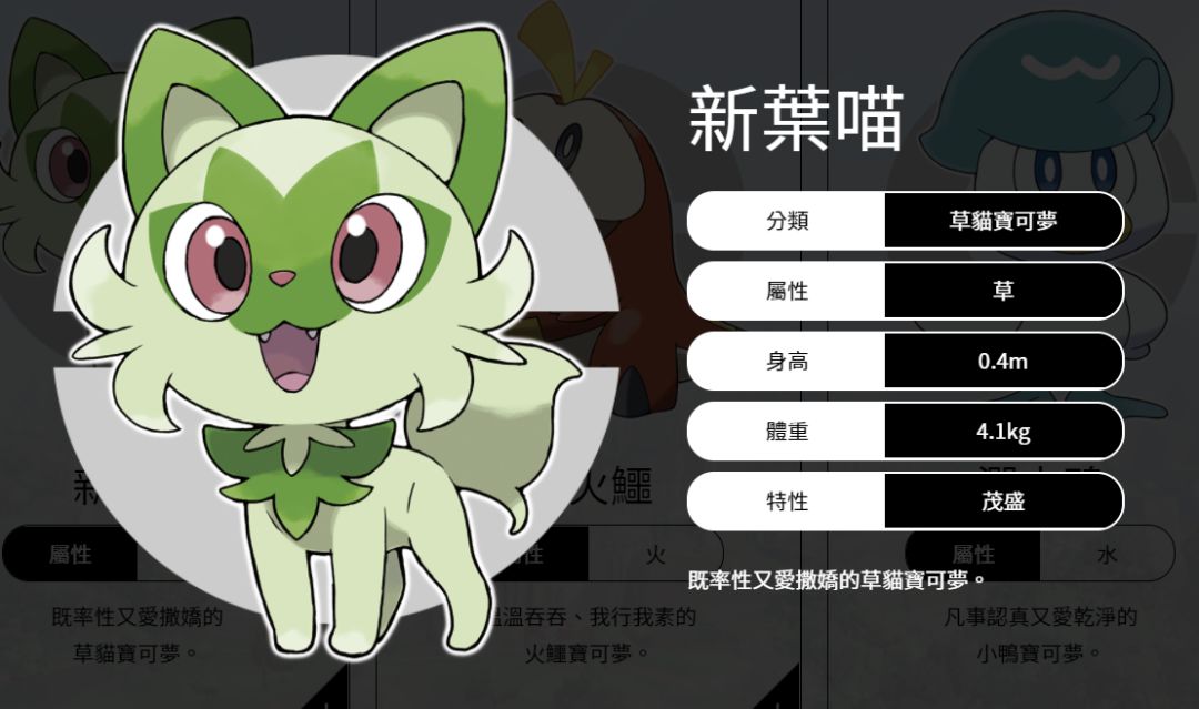 御三家:新叶喵、呆火鳄、润水鸭,分别属于草猫、火鳄、小鸭。