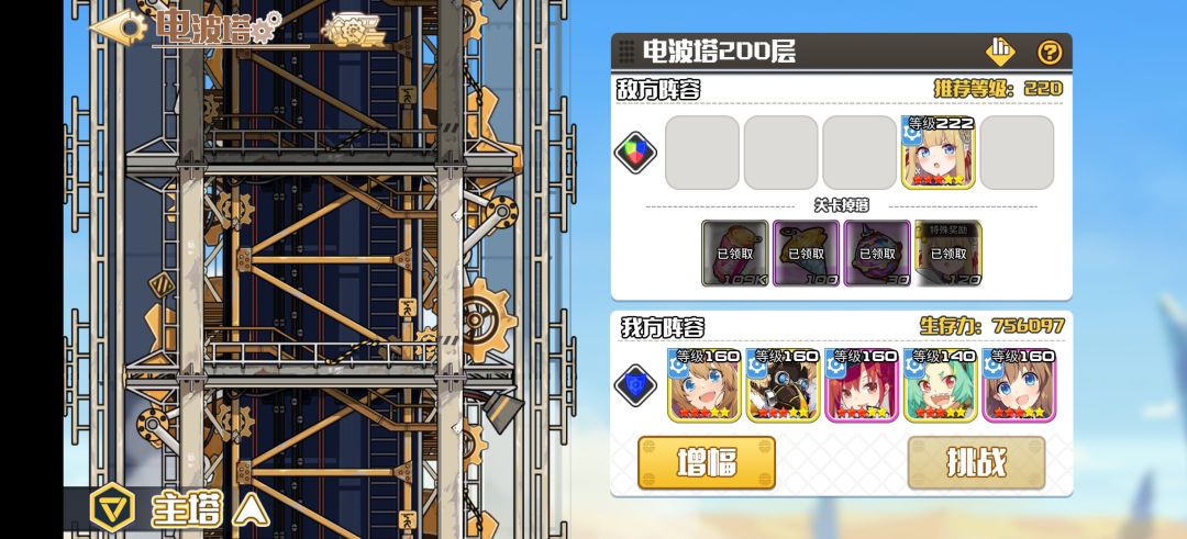 电波塔主塔200层已过,核心永远有多丽丝和小薇尔,红队亚利莎+拜耳+t蕾芙,绿队大薇尔+大厨+小厨,蓝队大厨+小厨+琪奥露/乌鸦。如果练度够高,三队有两队就行(也许),我本人是三队都用了(但是我个别精进没满)。餐厅技带减伤的,手操放多丽丝和小薇尔的控制技能以达到控制最大化,阵容闪电和阵地换着试,试了一晚上通关了!恭喜我自己!