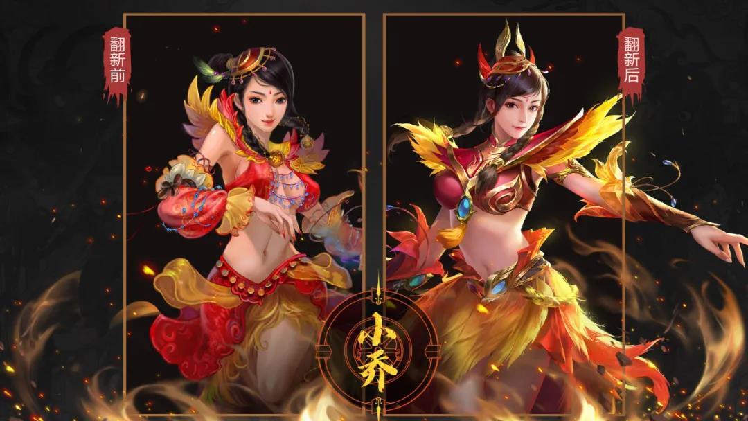 小乔的整体造型并未进行很明显的改动,依旧保留了大量的火焰的元素,但是小乔从服装到造型都做了大量细节上的优化,比如“赤炎束衣”的裙摆,优化过后使得上面的羽毛更加栩栩如生。