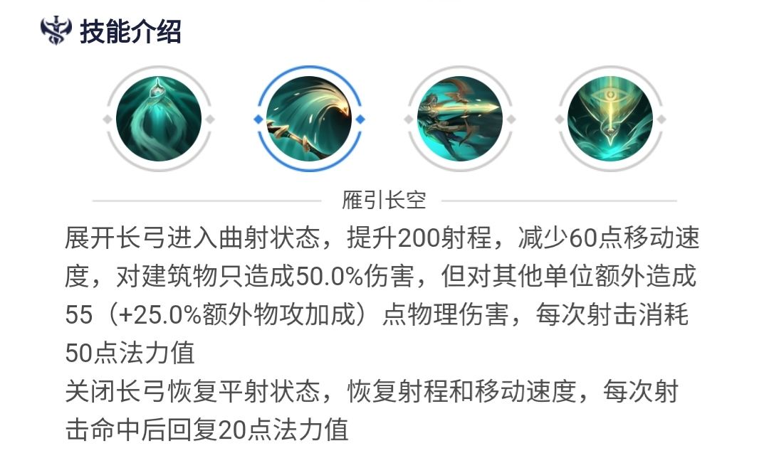 使用后进入曲射状态,提高射程,减少些许移速,对塔只造成50%伤害,对其他单位额外造成物理伤害,每次普攻消耗法力值,关闭曲射状态,恢复射程和移速,每次普攻命中单位回复法力值。