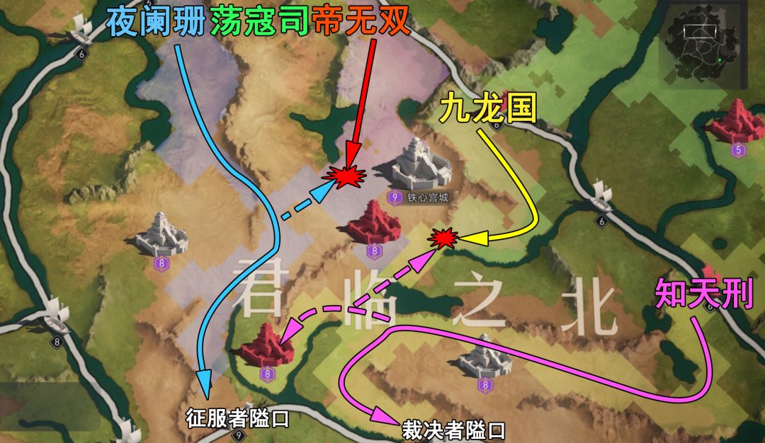 经此一役,大鲨鱼也明白想进君临就只有正面强攻一条路,随后便又一次回到了帝王朝所占7级渡口前,开始了为期两个日夜的攻防战,在双方都付出巨大战损后,大鲨鱼终于如愿拿下渡口,继续朝凯旋者隘口推进,而帝天下则占领了大鲨鱼后方数个城池,最终形成了如下局面。