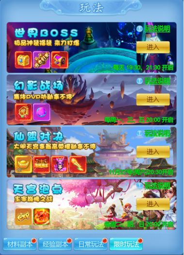 如果您是初次接触游戏的玩家,相信您对游戏的一些系统玩法还不是很熟悉,现在由小编给大家介绍一下游戏内的限时玩法,让大家对副本有初步了解~