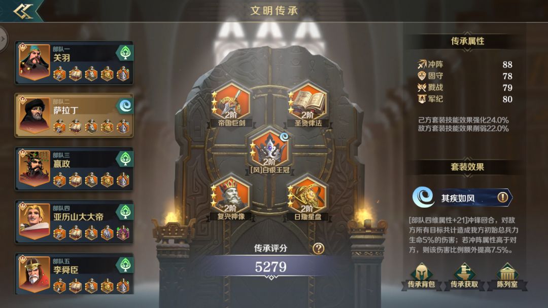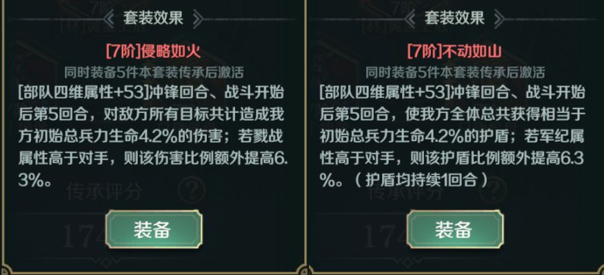 侵略如火和不动如山传承套装可在冲锋回合及战斗第五回合给敌军造成伤害或给己方提供护盾,适合持续输出的队伍或抵挡持续输出的队伍携带。