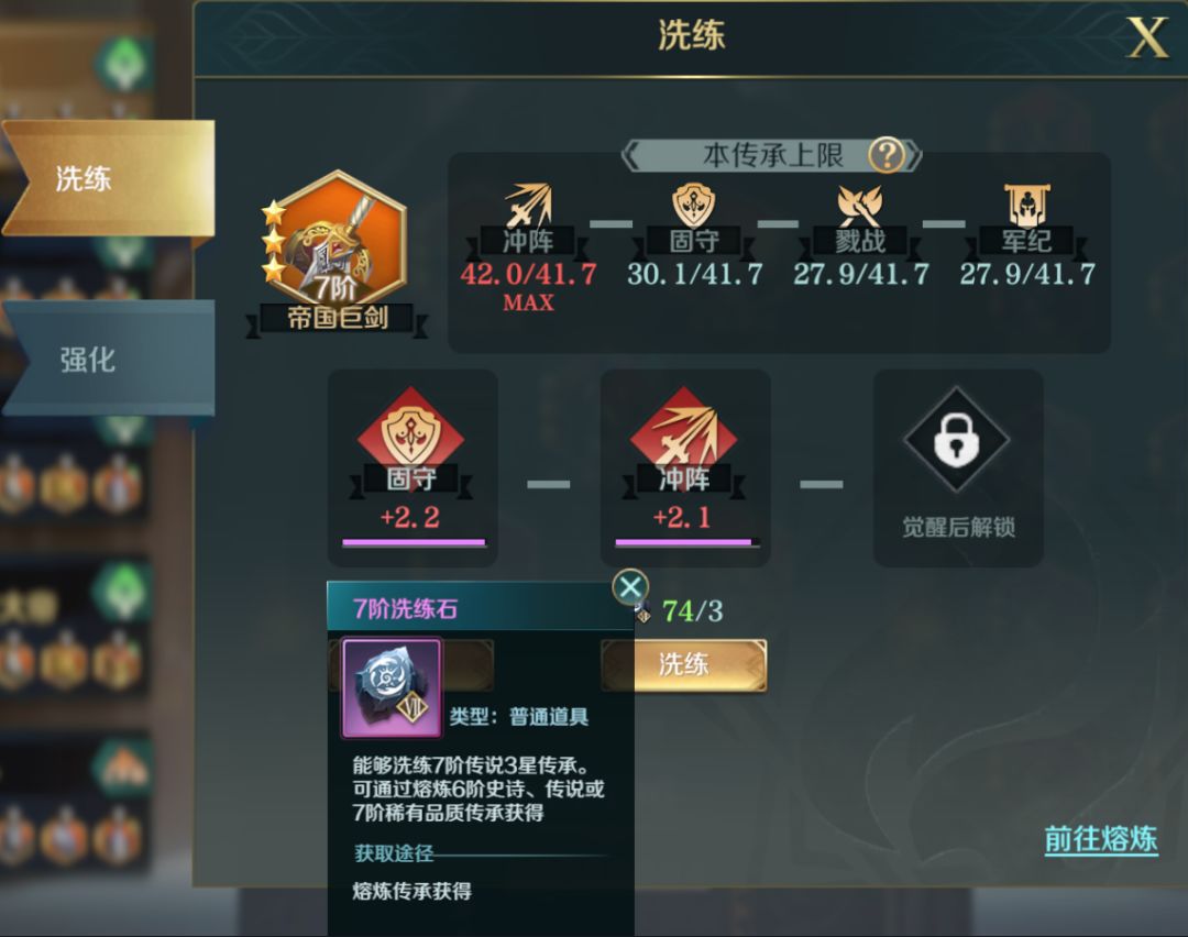 洗练可以通过消耗通过熔炼文明传承以及讨伐文明遗迹所获得的洗练石来提升文明传承的自带属性。
