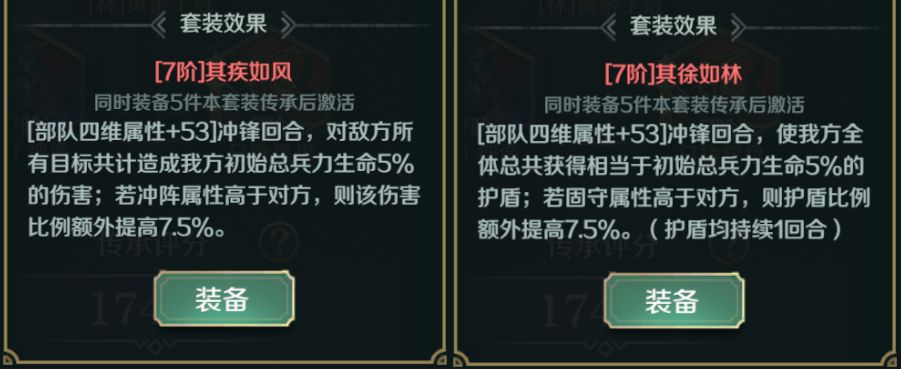 其疾如风和其徐如林传承套装可在冲锋回合给敌军造成伤害或给己方提供护盾,适合想要在前几回合造成更高爆发伤害或抵挡高爆发的队伍携带。