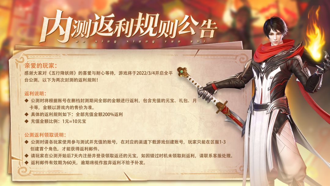 《五行降妖师》公测日期定档2022年3月4日,同时《五行降妖师》预约活动仍在进行中,欢迎大家预约+关注,更多预约奖励和开服好礼将在公测开服后第一时间送到各位的手中。参与锅计费删档测试的充值玩家将会在游戏正式上线后与游戏内领取倒返利福利哦,下面请看返利公告~