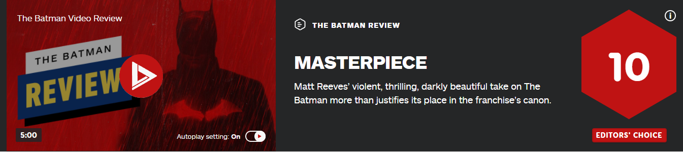 IGN认为:马特·里夫斯版《蝙蝠侠》的暴力、惊险、暗黑美学,更加证明了它在《蝙蝠侠》这个经典系列中的地位。