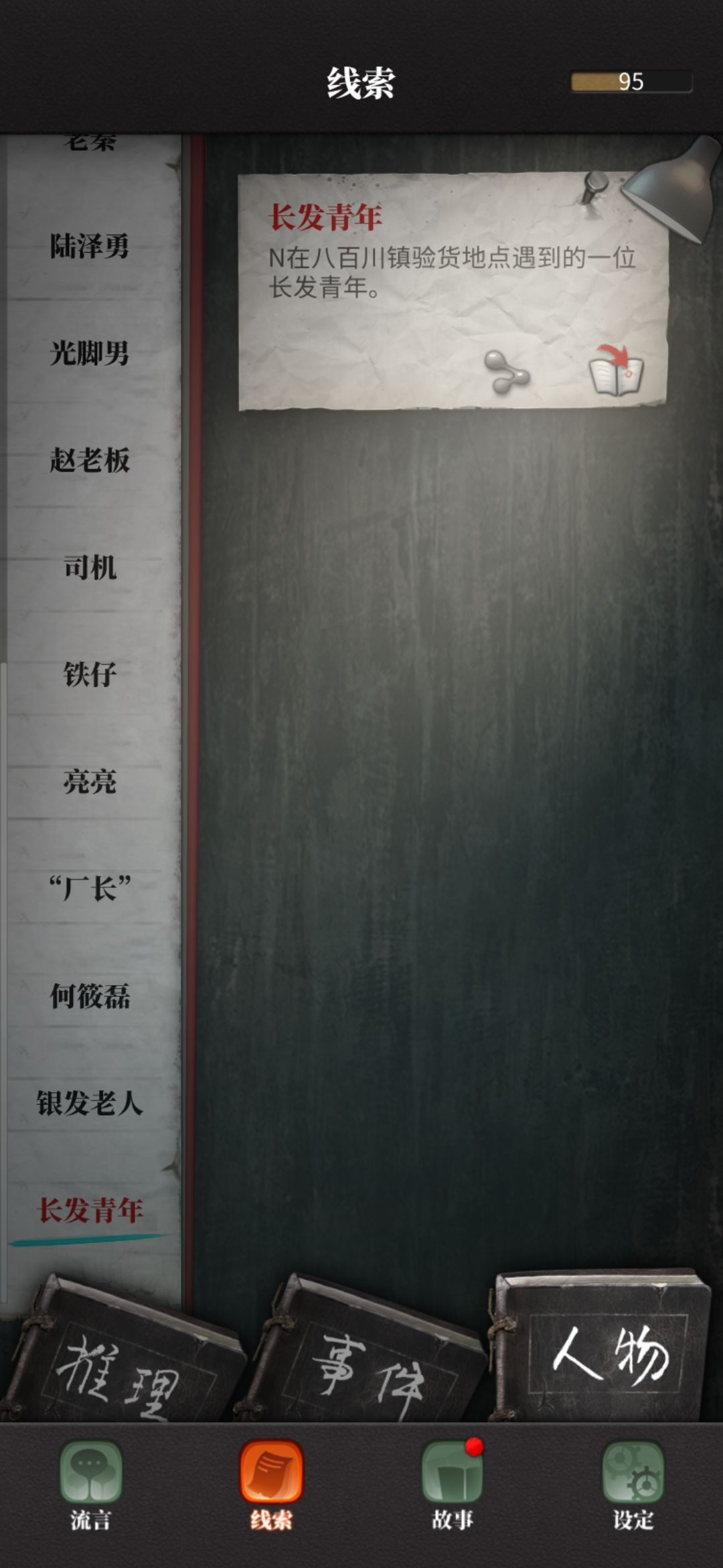昨晚和今早,同样的问题。昨晚,我读完回忆篇第八章,找到隐藏线索“年轻女人”,出去准备使用线索,结果线索显示已经使用过的那种灰色,我跳走再回到那个界面,那条线索连记录都没了,最近的线索只到这里: