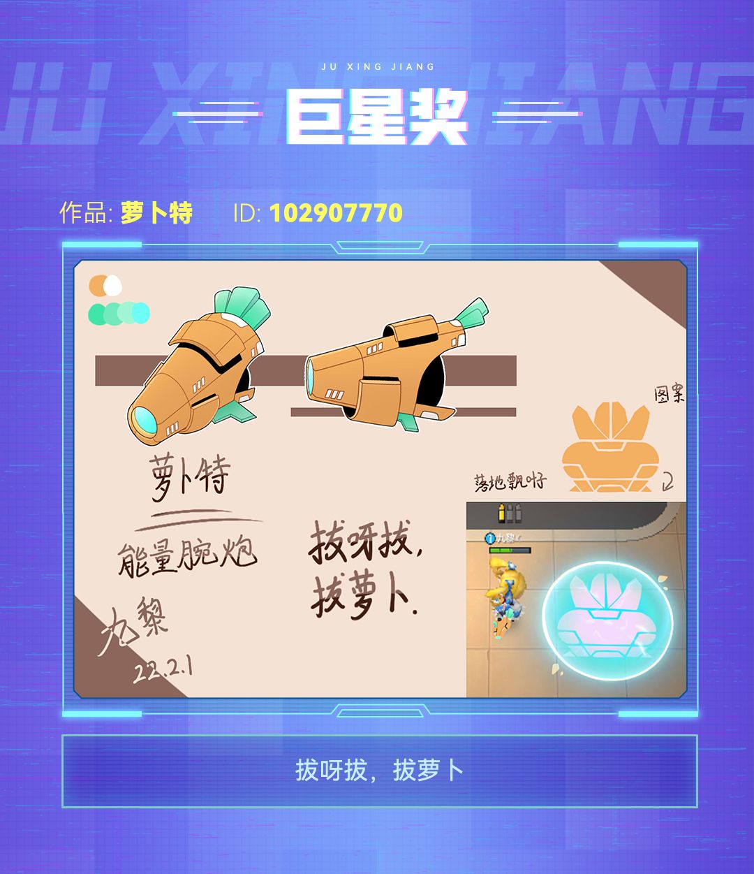 本次获得巨星奖的作品是“萝卜特”!嗯!能量腕炮的皮肤给它准没错!项目组的大家对它赞不绝口呢~小学妹都想象出自己变身小兔子拿着它的样子啦~~我们一起来看看吧!