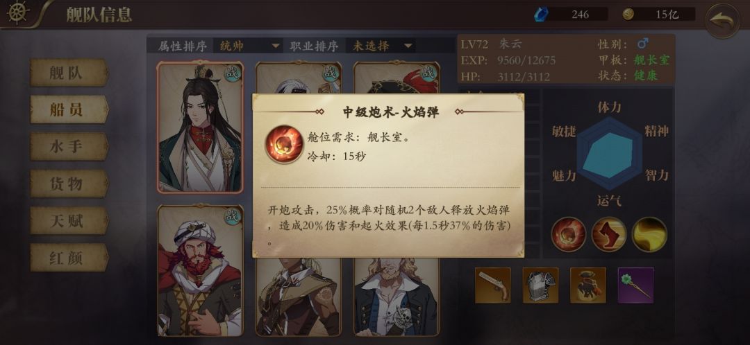 朱云的三个技能,前两个为燃烧技能,后面这个是船员经验获取和城市发展提高的技能。朱云前面的两个燃烧技能虽然在四大角色当中是独有的,但是在众多船员当中,他不是唯一的。非洲海盗王巴沙洛缪.罗伯茨,大海盗徐直,南美海盗王卡特琳娜,加勒比海盗王班杰明,卡萨布兰加的莱因哈特,商城里的颜思齐都有着跟朱云一样的燃烧技能,(如下图)