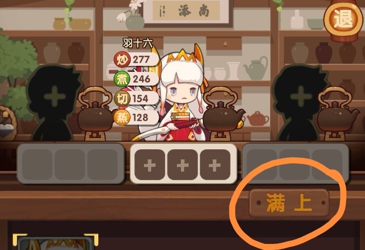 2.重复上一轮做菜方案时,可直接点击最右侧厨子下方的“满上”按钮。如果不小心点到选菜页面,点击厨房(下图截取部分)空白处即可重新显示“满上”按钮。