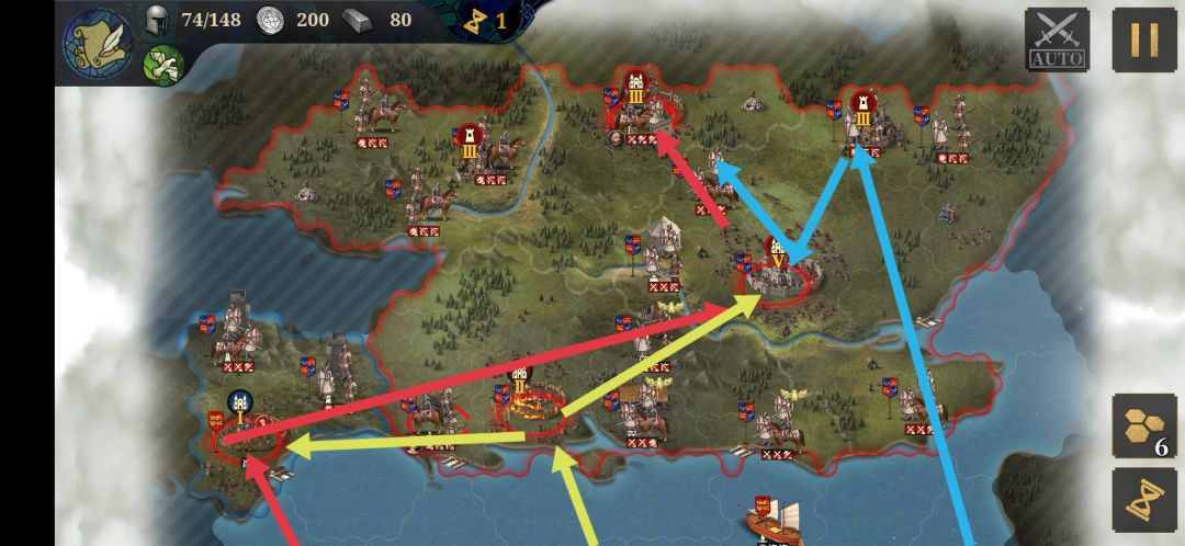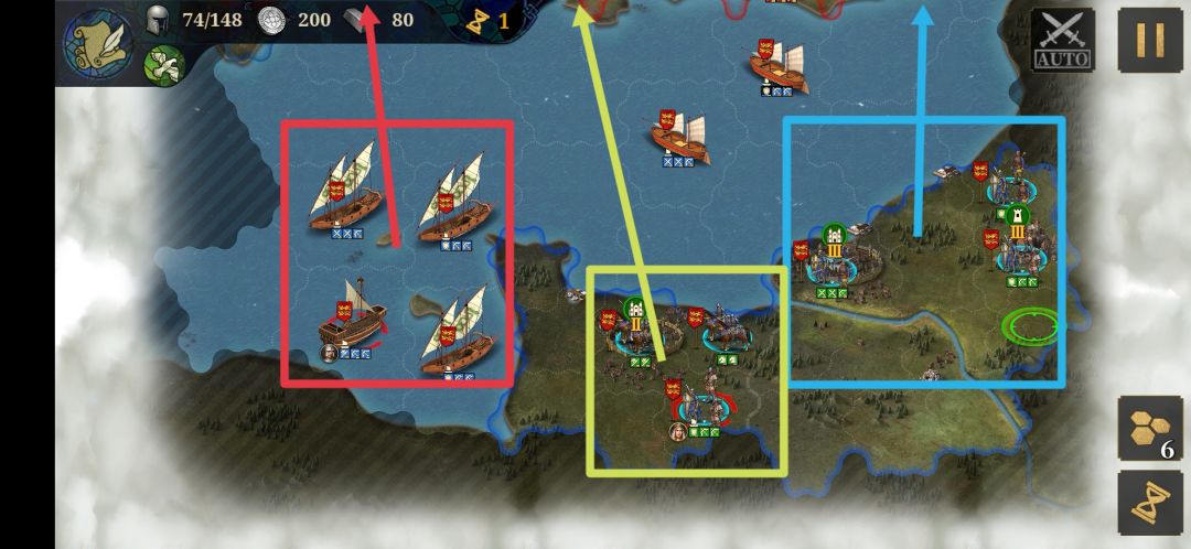 蓝框为我军一队,目的是清理岸边敌军后,沿蓝线迅速前往右上占领三级城堡(这里建议留守一只残血部队站住三级城堡,等伦敦城打下来再撤)。等二队准备好后,对伦敦发动总攻,随后合兵进攻最后一座城;