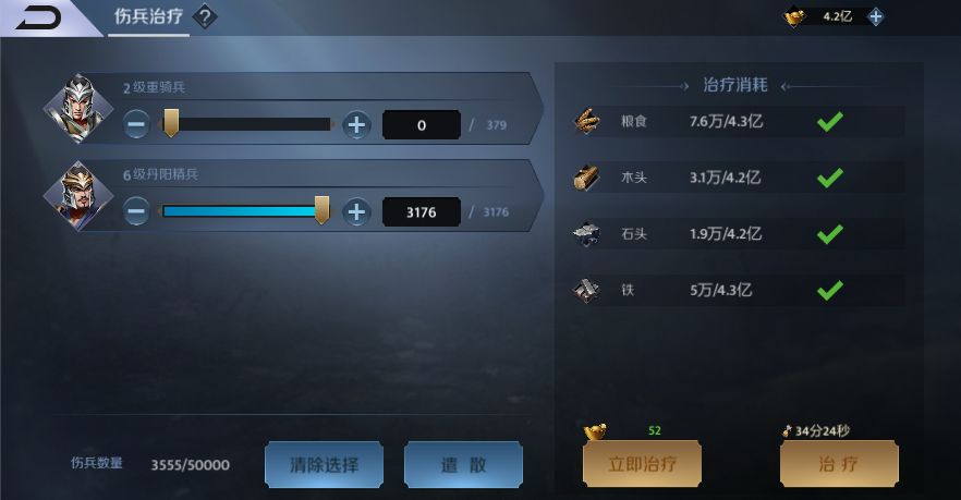 点击这个小葫芦即可进入伤兵治疗界面,主公可自由选择需要救治的兵种、数量等,消耗少量的资源和时间即可完成伤兵的治疗哦。