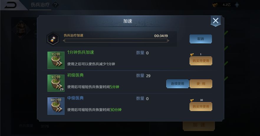 如果主公着急用兵,可使用道具或黄金加速伤兵治疗。