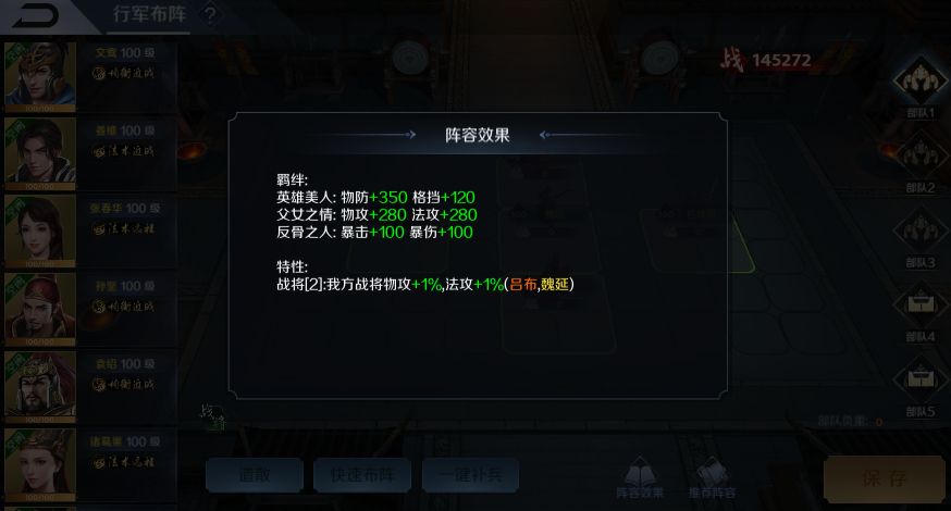 推荐阵容:前排吕布,中排吕玲绮、魏延、董卓,后排貂蝉,以吕布为核心,凑齐其所有羁绊,爆炸输出,只不过吕布在前冲锋陷阵时看起来总感觉头上有点绿油油的。