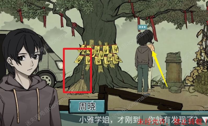 3.下车后来到村口,先和小雅交谈,然后在大树旁边拾取【扫帚】。3