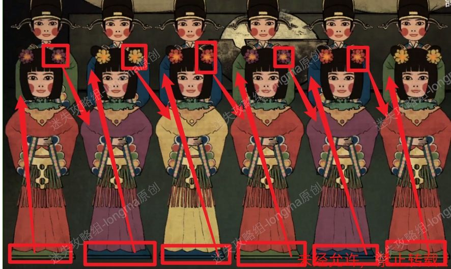 50.向右走,来到坟场,点击第1座有墓碑的坟,观察前面摆放的小人(前面女子头上花朵的颜色对应的是下一个女子身上衣服的颜色,女子脚下的颜色对应的是后面男子衣服的颜色)。50 50.1