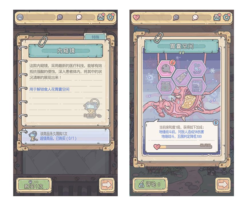 b.亲和度达到500时,地缝商店将刷新道具『内窥镜』,可用于解锁食人花胃囊空间