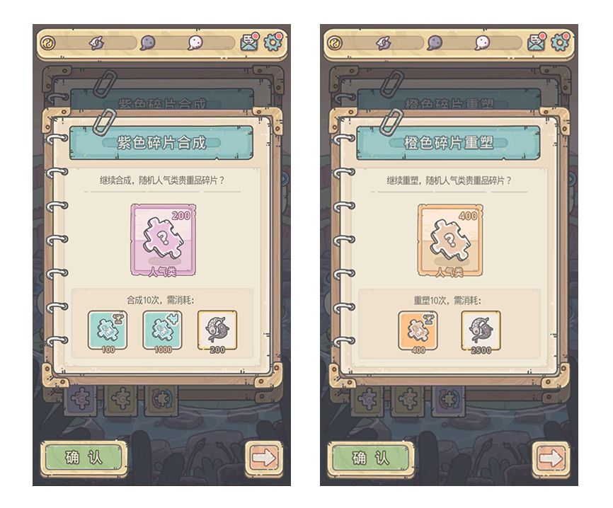 蜗爷们在进行碎片合成或重塑后,将会出现“合成1次”与“合成10次”的选项,可自行选择合成次数,再消耗贵重品碎片及阴阳鱼,进行碎片合成或重塑。