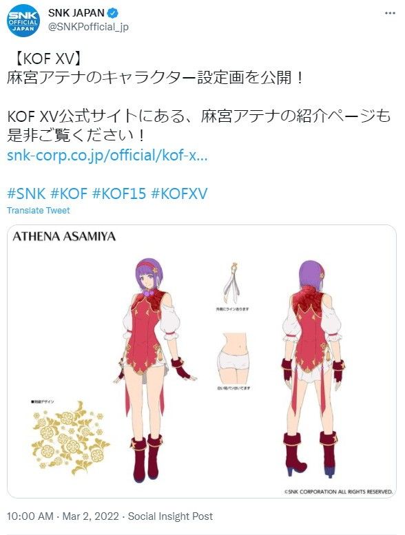 》已正式发售,备受玩家好评,今日(3月2日)SNK官方在推特上公布了《拳皇15》麻宫雅典娜角色设定图,一起来看看吧!