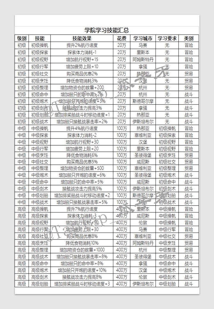 在帖子里想找相关的内容结果没搜到,就自己整理了一下,内容包括学习技能所在的城市,技能效果说明,费用等,供大家玩儿的时候进行参考,按需求逐步升级。内容如有错漏欢迎提出,随时改正