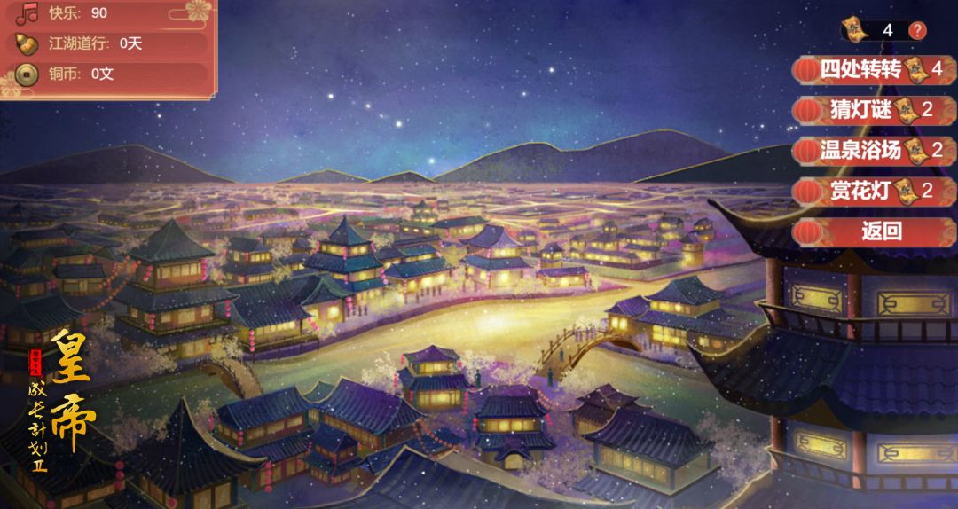 新增游园项目:猜灯谜、赏花灯、关扑、转盘、温泉浴场、花车表演等,有一些是固定项目,有部分项目为随机出现的项目。
