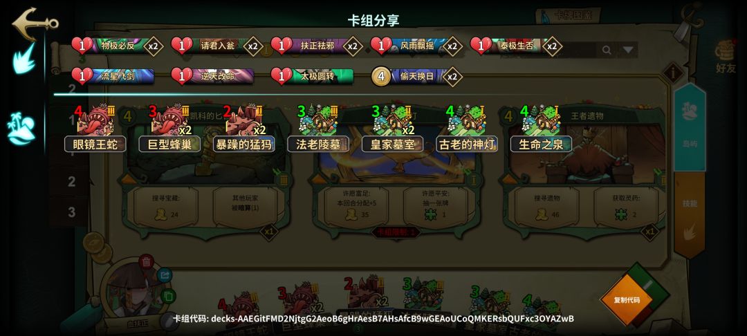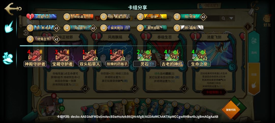 道童,每阶段出门都需要叠阴阳,而经常出现红岛出门的情况,所以最好带大慈大悲,会剑诀,中庸之道,阳修身等出门卡,而且2.3阶段压力比较大,推荐1阶段多过牌,1阶段起手只有3张,配合有限