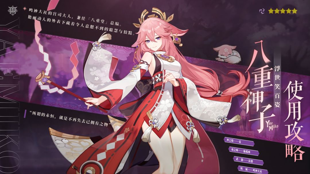 八重神子(以下简称“八重”),5星雷系法器角色,隶属于稻妻鸣神大社。