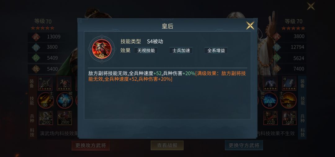 这样的配置适合大部分中低战,双兵种的配置可以极大加强容错率,避免被荀攸副将技能或者魂岳飞之类的武将克制,双刀和重骑兵都自带对刀兵的重伤,对付目前的主流武将都很适合。