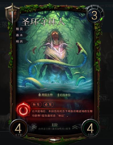 第三个点在于如何叠标,暗面妨碍的效果是对每个有标记的敌人减少攻击力(已知bug是有标记的骷髅在部队里面会显示减少两攻,非部队情况下仅减少一攻),因此手上持有暗面妨碍者的情况可以先手下344守林人。而打标射手赫萝攻击的是最上方的标记,因此最大化输出是黎亚加部队往上面叠双标,但是值得注意的是如果对方先下的部队的话,在部队上面叠的标作为英雄携带部队后是不受到赫萝攻击加成的。