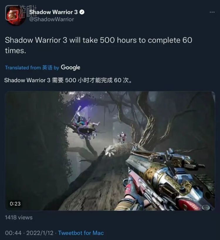 对于同出波兰的开发商Flying Wild Hog而言,他们支持的意味肯定更多一点。他们的FPS游戏《影子武士3》在3月2日发售,官推说,在这部游戏上花个500小时能够通关60遍,换算下来也就是要用8.3小时通关一周目。