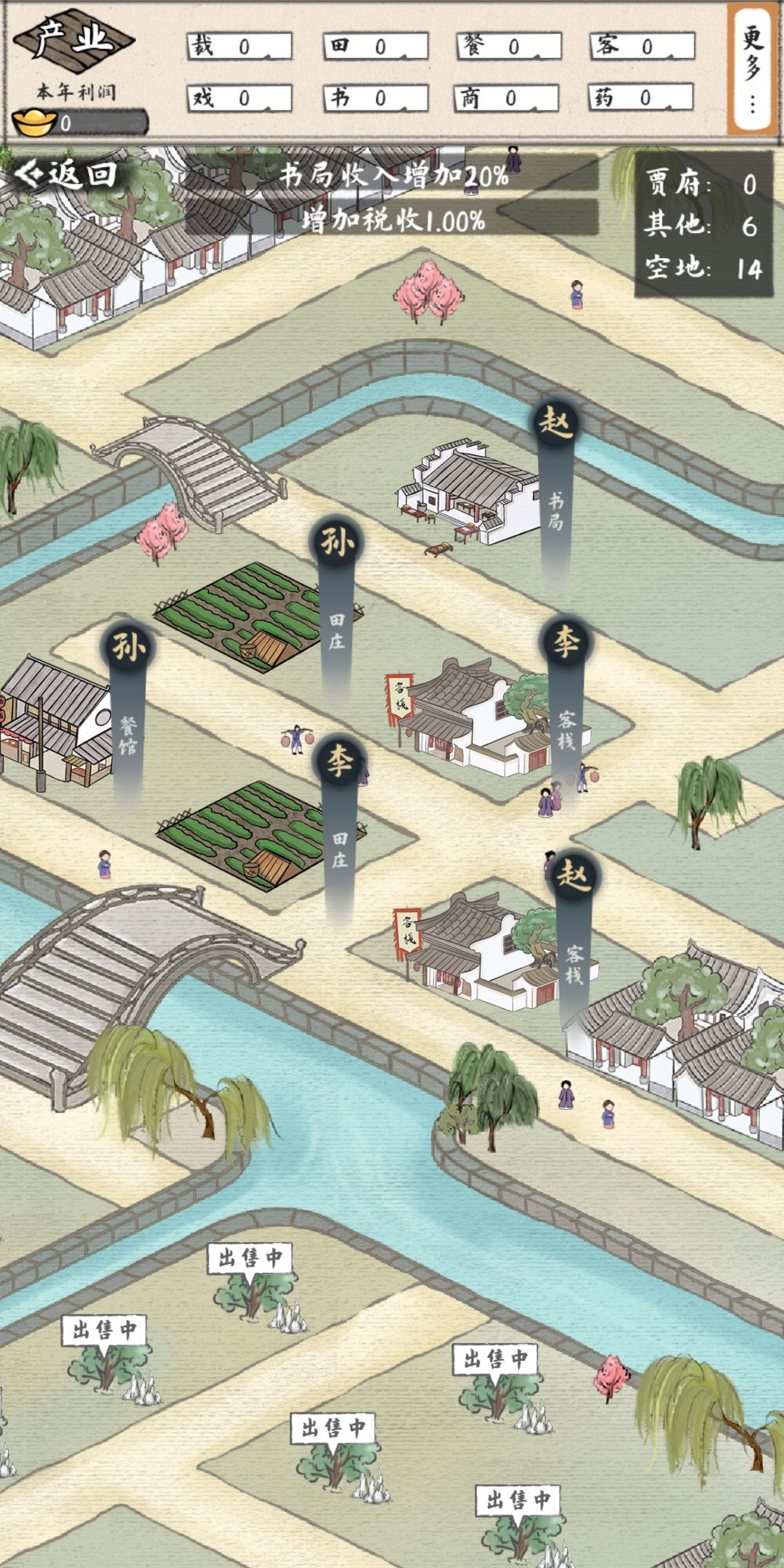 城外的产业共分为两种,一种是已经建设完成,有特定产业类型的其他家族的产业,另一种则是待出售待建的空地。前者可以更快的获取收益,但受到产业类型的限制,无法根据时令调整内容产出;后者则需要等待一定时间来建设,并且随着购买的地皮数量增加,购买费用也会不断增加。