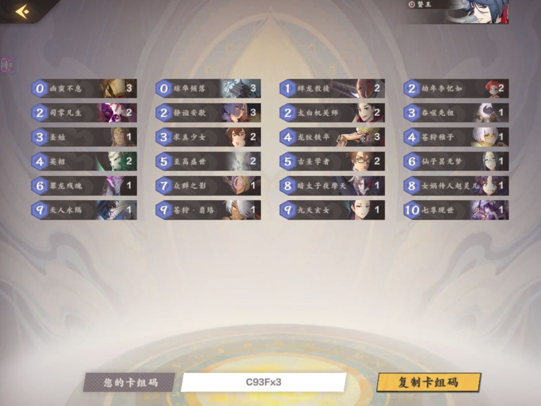 2 凶蛮不息:首先是对冲琼华过牌来补充疲劳;其次是回收1张(充能3张)部署资源,带的高费部署都是回复或解场异能,回收的时候不一定执着于高费牌,6费及以上7张都是橙红且一张,5费2张513,4费6张(2张英招,3张龙纹,1张稚子),3费1张圣姑+2张少女,2费及以下6张。结合玄女,977,灵儿,太子等这些高费牌在实际对局中的使用,其实回收的主要费率集中在456;第三点,琼花过牌,也会爆牌,爆进墓的部署实现回收,看起来和前两点类似,但出发点有差别。