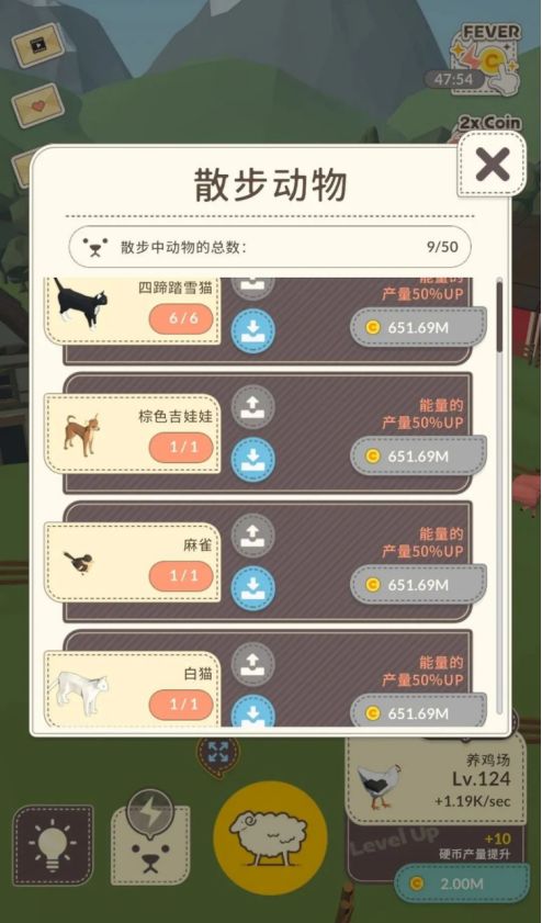 建造了这些牧场后,当然必须有动物帮我们看护养殖场,可以解锁的看护散步小动物的种类多达50种!
